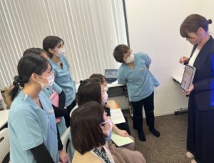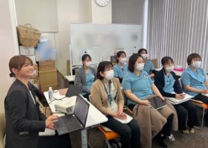 研修では、スタッフ一人ひとりが真剣な表情で話を聞き、メモを取りながら理解を深めていました。