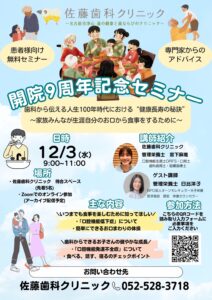 おかげさまで、佐藤歯科クリニックは今年で開院9周年を迎えます。 日頃の感謝の気持ちを込めて、患者様向けに無料の記念セミナーを開催いたします✨ 今回のテーマは 「歯科から伝える人生100年時代における “健康長寿の秘訣”」 〜家族みんなが生涯、自分のお口から食事をするために〜 ——食べること・話すこと・笑う...